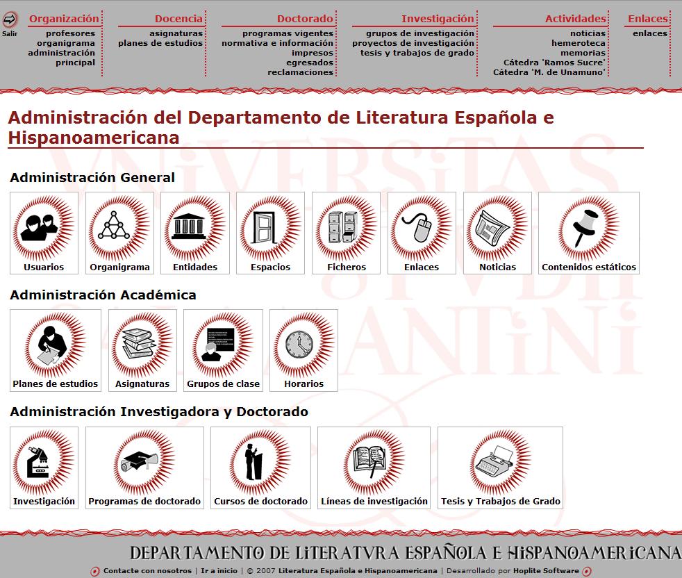 El Departamento de Literatura Española e Hispanoamericana dispone desde este curso de una nueva página web a la que se han incorporado aplicaciones y herramientas que facilitarán las tareas de gestión propias de la actividad académica, a la par que ofrece a sus miembros varios servicios de apoyo a la docencia. La nueva página muestra el compromiso del Departamento con la incorporación de las nuevas tecnologías de la información, situándolo en una posición ventajosa de cara a su adaptación al Espacio Europeo de Educación Superior.
